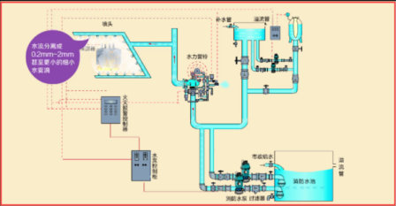 該系統(tǒng)在組成上與雨淋系統(tǒng)的區(qū)別主要在于噴頭的結(jié)構(gòu)和性能不同,而工作原理與雨淋系統(tǒng)基本相同。它是利用水霧噴頭在較高的水壓力作用下,將水流分離成細(xì)小水霧滴,噴向保護(hù)對象實(shí)現(xiàn)滅火和防護(hù)冷卻作用的。