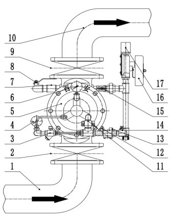 1.供水側(cè);2.消防信號蝶閥(常開);3.復(fù)位球閥(常閉);4.供水側(cè)壓力表;5.閥組;6.系統(tǒng)側(cè)壓力表;7.自動排水閥;8.放水球閥(常閉);9.消防信號蝶閥(常開);10.系統(tǒng)側(cè);11.防復(fù)位閥;12.警鈴試驗球閥(常閉);13.消防電磁閥;14.緊急手動球閥(常閉);15.報警控制球閥(常開);16.水力警鈴;17.壓力開關(guān)