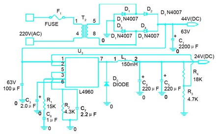 電源電路采用開關(guān)電源設(shè)計,具有高效率、低損耗的特點(diǎn)。采用開關(guān)控制芯片l4960,能提供5.1~40v的輸出電壓和2.5A的輸出電流。電源電路如圖5所示,通過調(diào)整兩個電阻r3和r4,以產(chǎn)生12-24v直流電壓,24v(dc)用于plc電源,44v(dc)直接取自整流橋側(cè)供給直流電機(jī)。如果用于光伏逆變系統(tǒng)的跟蹤系統(tǒng),220v(ac)可以直接取自光伏逆變電源。